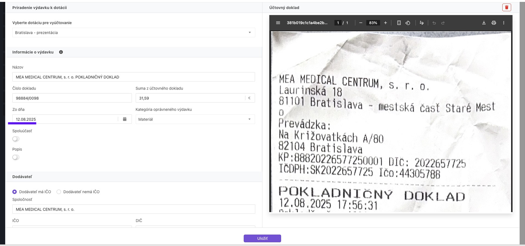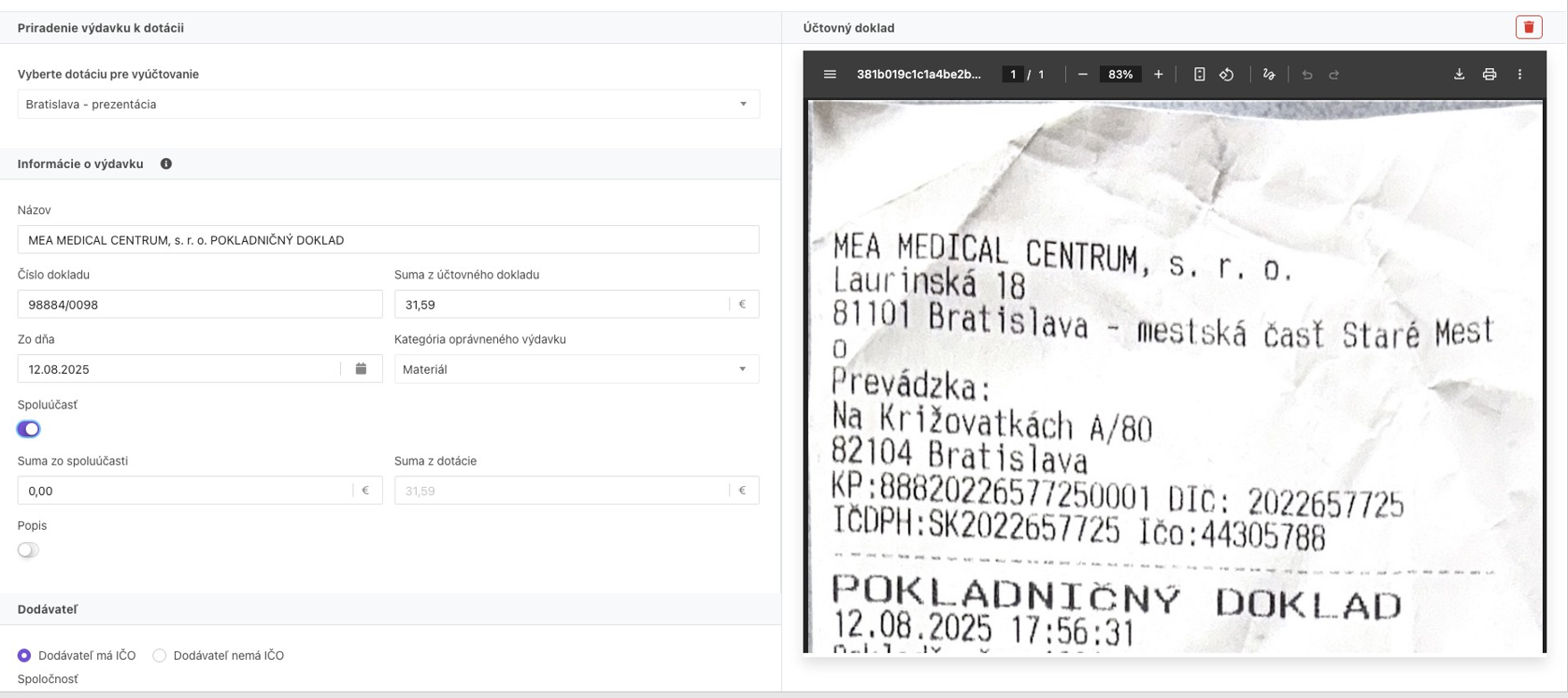 Vytvoríte výdavok nahratím účtovného dokladu a vyplníte informácie, ktoré sa od vás žiadajú ako pri každom výdavku.