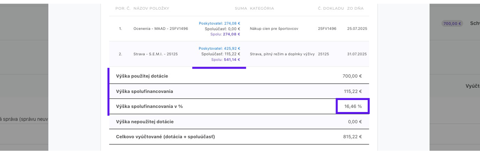 V nej sa nachádza prehľad vášho vyúčtovania a aj výška spolufinancovania v %, ktorú musíte splniť v dostatočnej výške.