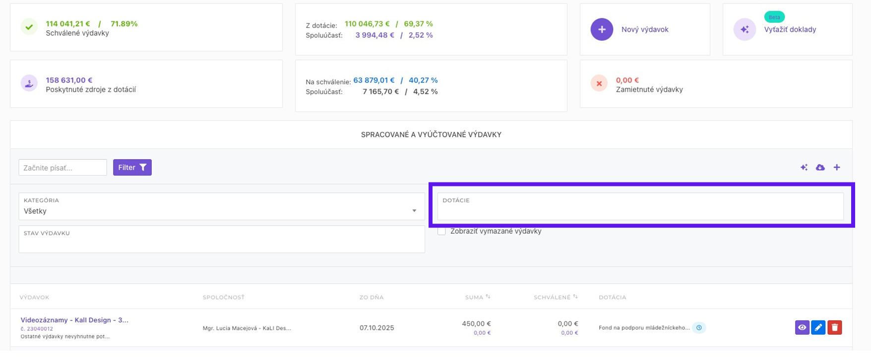 Vyberiete si vami zvolenú dotáciu, ktorú ste chcete vyúčtovať a kliknete na ňu. Systém vám automaticky zobrazí štatistiku v hornej časti len pre túto jednu dotáciu a v spodne uvidíte len výdavky, ktoré sa týkajú tejto dotácie ako uvidíte na ďalšom obrázku.
