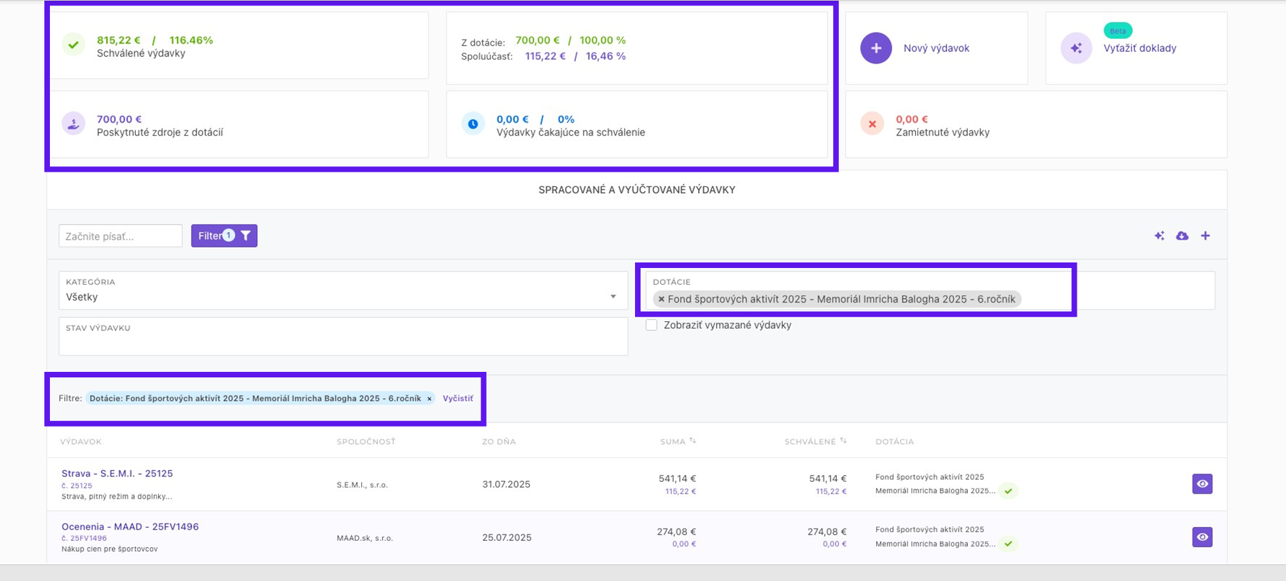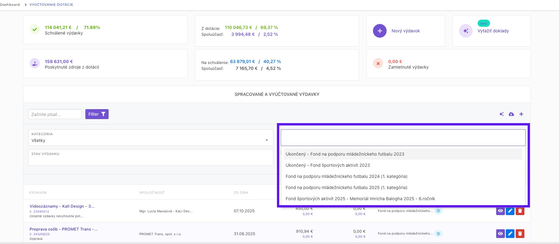 V tejto ukážke som vybral Fond športových aktivít 2025 a vidím, že poskytnuté zdroje z dotácií sú 700€ a aj ďalšie štatistiky už vyúčtovaných a schválených výdavkov. V tomto prípade sú 2 účtovné položky.